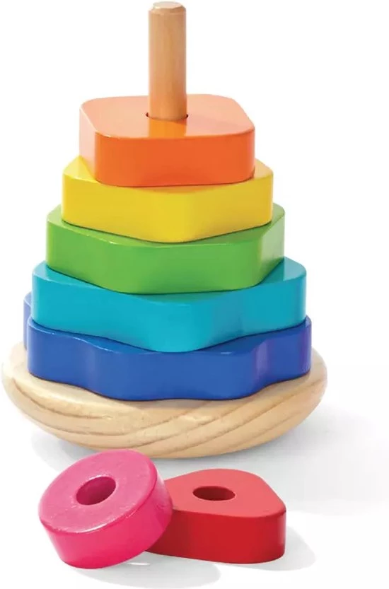 De regenboogstapeltoren bestaat uit verschillende vormen blokken en kan op de staaf worden gestapeld. Hiermee stimuleer je de coördinatie en motoriek van jouw baby;