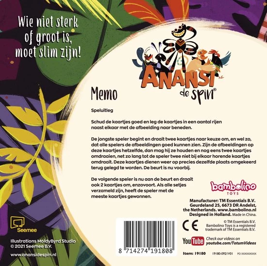 Memo is bij iedereen bekend en kinderen zijn er helemaal dol op. Voor dit memospel zijn afbeeldingen gebruikt uit de serie Anansi de spin en dat maakt het voor kinderen heel herkenbaar en extra leuk. Anansi zegt vaak: Wie niet sterk of groot is, moet slim zijn! Dus ga snel op zoek naar de dubbele kaartjes van Anansi en zijn vrienden, Schildpad, Konijn, Aap, Krekel en Haan. Dit memospel bevat 40 kaartjes van zeer stevig karton. Voor kleinere kinderen is het verstandig eerst met een beperkt aantal kaartjes te beginnen.