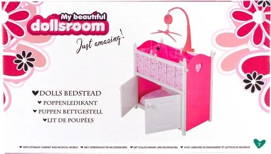 My Beautiful Dollsroom roze-wit houten poppen-ledikant met opbergkastje en muziekmobiel. Geschikt voor kinderen vanaf 3 jaar.