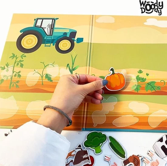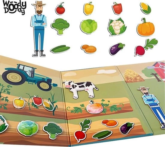 Dit uitklapbaar boerderij bord zorgt voor veel plakplezier met verschillende magneetjes in de vorm van boerderijdieren en groenten. Plak gerust op los wat volgen jou en jouw zoon of dochter het beste bij jullie passen. In de aarde kun je verschillende groeten poten zoals kool, sla, pompoenen etc.