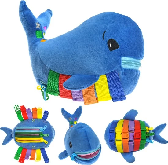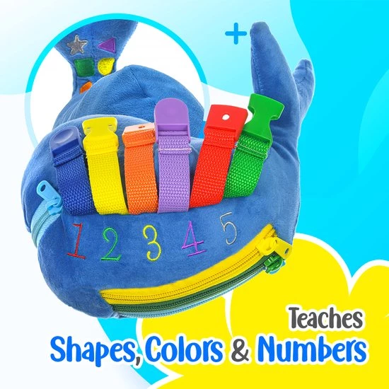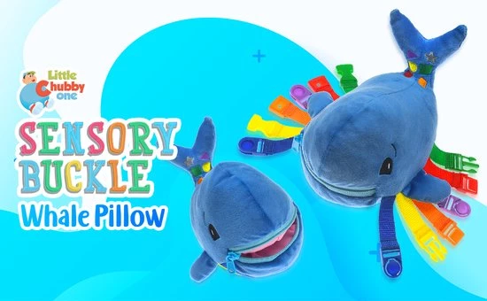 Little Chubby One’s Sensory Buckle Whale Pillow is uitgerust met zes riemen op de buik van de walvis die worden bevestigd met een verscheidenheid aan gespen. Maak de gespen los om drie ritsen te vinden die ritssluiting en openritsen.