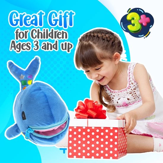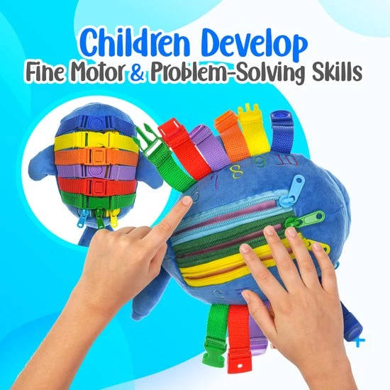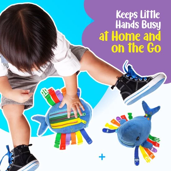 Ontwikkelingsspeelgoed: als kinderen de gespen aan de gekleurde bandjes bevestigen, biedt dit Sensory Buckle Whale Pillow tactiele en sensorische stimulatie en helpt tegelijkertijd fijne motoriek en hand-oogcoördinatie te ontwikkelen.