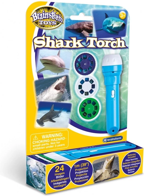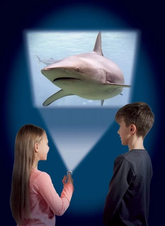 De zaklamp wordt geleverd met drie schijven met in totaal 24 kleuren haaien afbeeldingen.