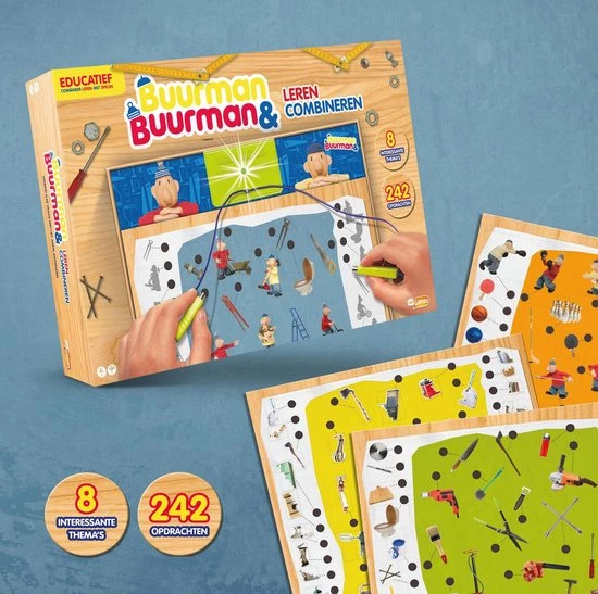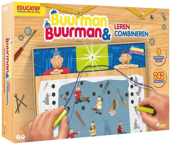 Buurman & Buurman leren combineren is een leuk en educatief spel. Probeer spelenderwijs verschillende thema?s, zoals kleuren, vormen en objecten, bij elkaar te zoeken. Vind samen met Buurman & Buurman de juistecombinatie en plaats de pennen bij de thema?s die bij elkaar horen. Klopt je combinatie? Dan wordt het licht GROEN! A JE TO!