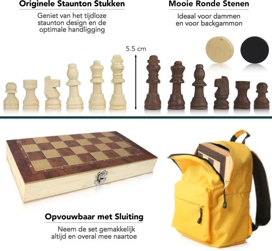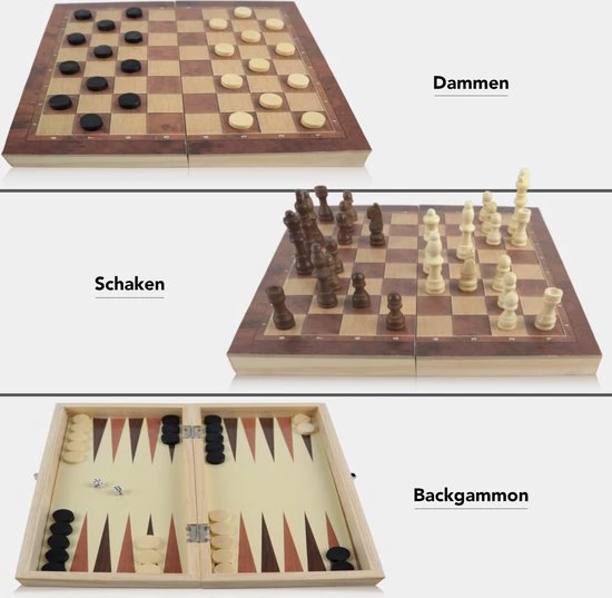 Heb jij altijd al een strategische schaakmeester willen worden? Of vind je het simpelweg leuk om soms een uitdagend bordspel te spelen? Dan is deze CheckMate IM Series 3-in-1 schaak-, dam en backgammonset ideaal voor jou. Voor ??n aantrekkelijke prijs heb je direct drie spannende bordspellen in een handig opvouwbaar bord. Met deze CheckMate set heb je alles om te beginnen en groeien als serieuze schaak-, dam- of backgammonspeler en ben je altijd voorbereid voor een gezellige spelletjesavond.