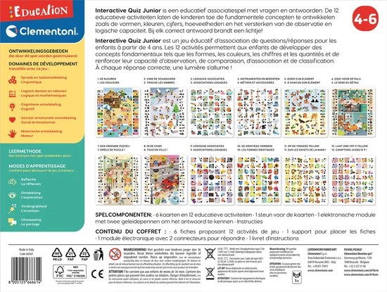 Clementoni ontwikkeld al jaren educatief speelgoed wat kinderen ondersteund bij hun ontwikkeling. Interactieve Quiz is een leuke activiteit die de nieuwsgierigheid van je kind prikkelt. Door middel van de verschillende niveaus blijf je leren!
