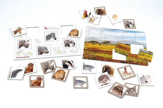 Dit leuke bordspel combineert een klassieke bingo met het ontdekken van het wondere rijk der dieren. De spelkaarten zijn verdeeld in thema?s gebaseerd op de omgeving waarin de dieren leven. Kinderen kunnen hun eigen thema bedenken en personaliseren met hun lievelingsdieren. Stimuleert het observatie- en associatievermogen en stimuleert kinderen om meer te leren over het dierenrijk.