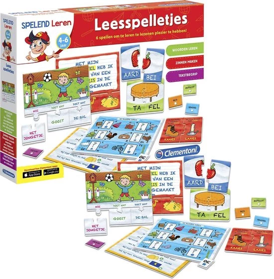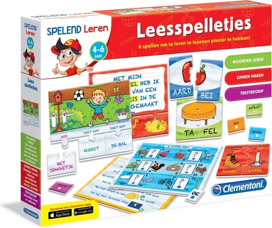 6 leuke spellen die kinderen helpen bij het leren lezen op een plezierige manier. Bevat vele leer-tegels en een bingo spel met rijmpjes. Een compendium van spelletjes die kinderen begeleiden, hen helpt om letters en lettergrepen te herkennen, leren lezen en het begrijpen van woorden en teksten.