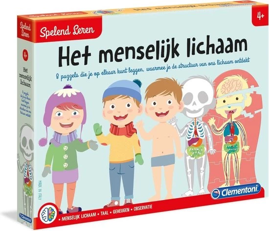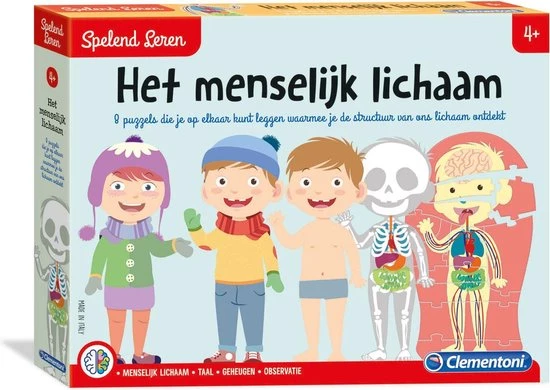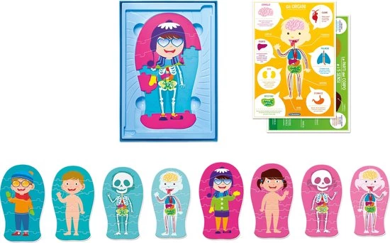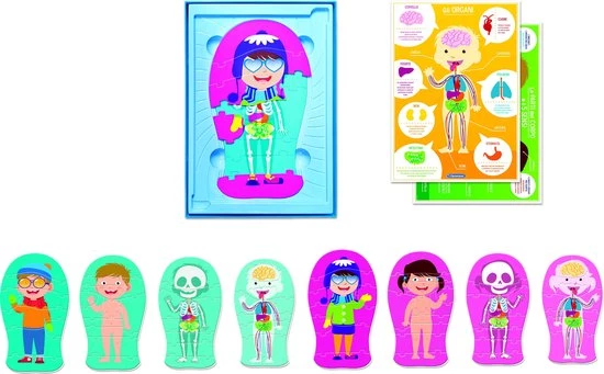 Een leuk spel om de samenstelling en de kenmerken van het menselijke lichaam te ontdekken. Het spel bestaat uit een serie stapelbare puzzels die je elk, stap voor stap, het menselijk lichaam laten ontdekken: van het skelet tot en met de organen, van de huid tot en met de kleren. Een gemakkelijke manier om kinderen het menselijk lichaam te laten ontdekken terwijl ze hun logisch denken, observatievermogen en associatieve capaciteiten ontwikkelen.