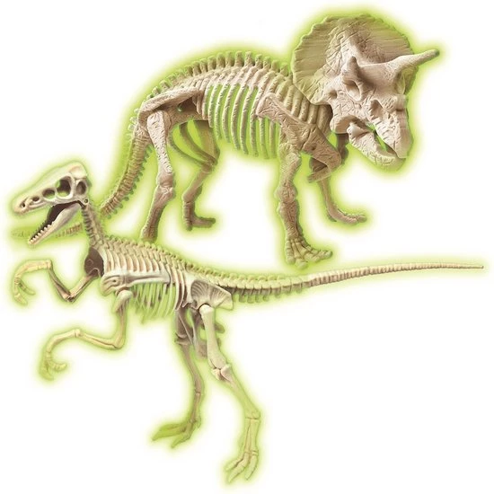 De wereld van Jurassic World is nog nooit zo leuk geweest, dankzij deze kit voor echte paleontologen! Graaf de stenen uit om de skeletten van de beroemdste dinosaurussen uit het verleden weer tot leven te brengen: de angstaanjagende Triceratops en de Velociraptor. De kit bevat een hamer, een beitel en twee stenen om dinosaurusskeletten uit op te graven. Zet de skeletten in elkaar en doe stap in het verleden om Jurassische avonturen te beleven! En als je het licht uitdoet… zie je ze gloeien in het donker! Een leuk en meeslepend spel voor alle fans van Jurassic World 3!