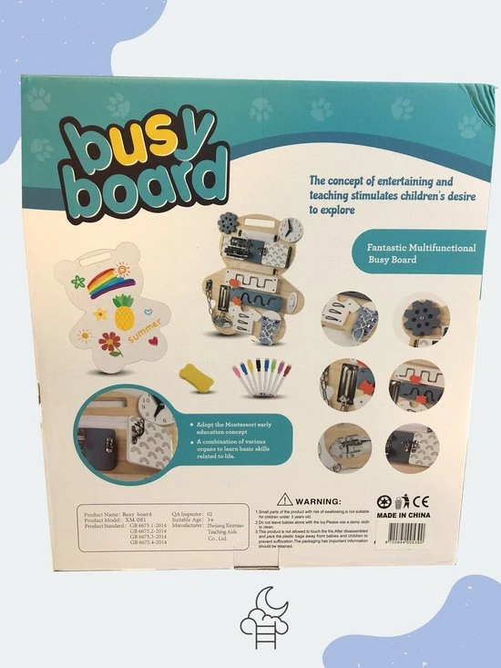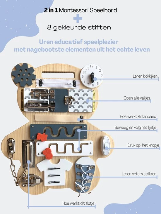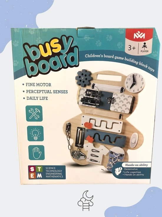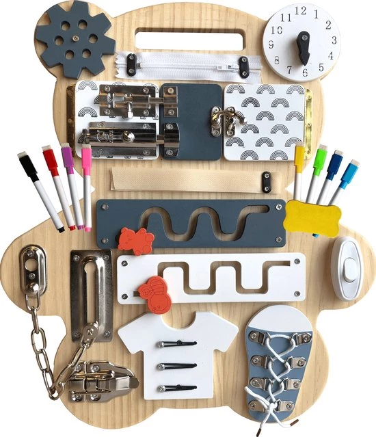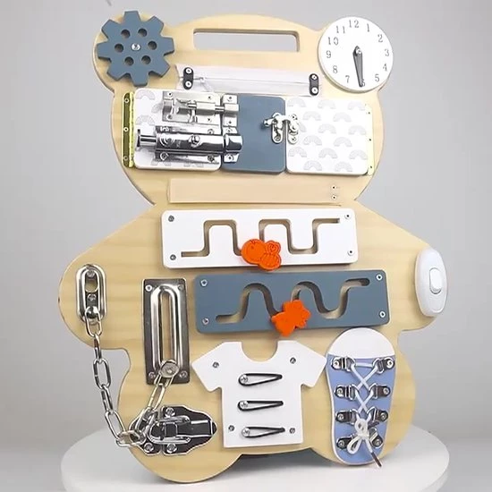 Op dit geweldige speelbord kun je van alles ontdekken. Er zijn verschilende onderdelen te verschuiven, te draaien of te openen. Draai aan de wijzers van de klok, laat het tandwiel bewegen en probeer de verschillende slotjes en ritsen. Er valt zoveel te ontdekken en vooral te leren met dit prachtige speelbord.
