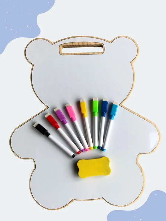 -2 in 1 multifunctioneel, op de achterkant kan er getekend en geschreven worden met de meegeleverde stiften