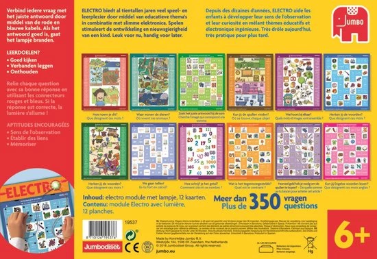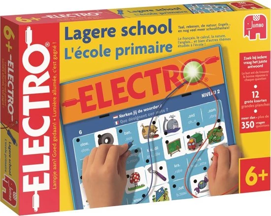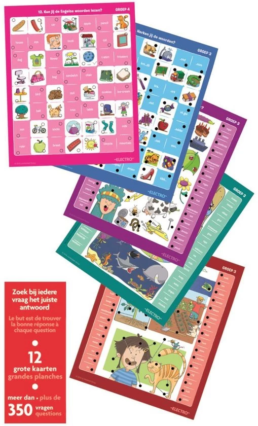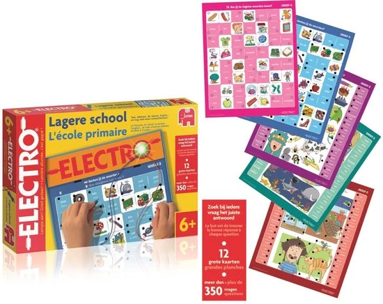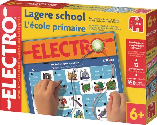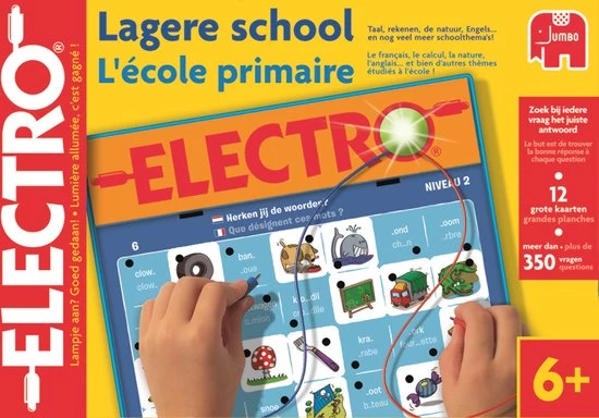Verbind iedere vraag met het juiste antwoord door middel van de rode en blauwe kabels. Als het antwoord goed is, gaat het lampje branden.’Electro lagere school’ bevat 12 grote kaarten met meer dan 350 opdrachten op 3 verschillende niveaus: