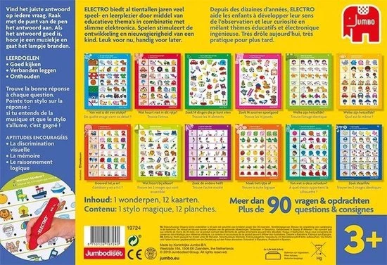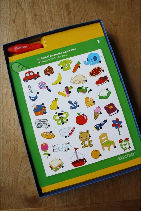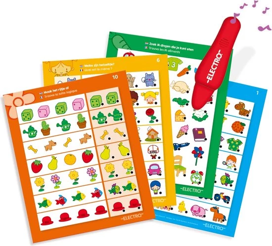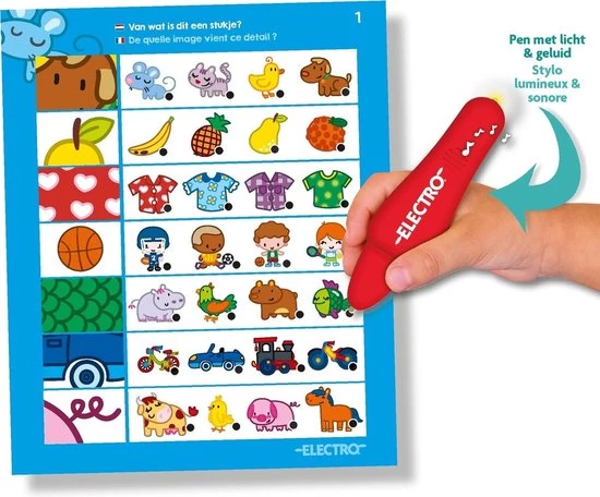 Electro biedt al tientallen jaren veel speel- en leerplezier door middel van educatieve thema’s in combinatie met slimme elektronica: een leuke manier om te leren over verschillen, overeenkomsten, silhouetten en nog veel meer! Vind het juiste antwoord op iedere vraag. Raak met de punt van de pen het antwoord aan. Als het antwoord goed is, hoor je een muziekje en gaat het lampje branden.