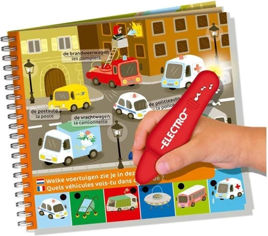Met Electro Wonderpen Mini Voertuigen leer je alles over voertuigen. Vind het juiste antwoord op iedere vraag. Raak met de punt van de pen het antwoord aan. Als het antwoord goed is, hoor je een muziekje en gaat het lampje branden.