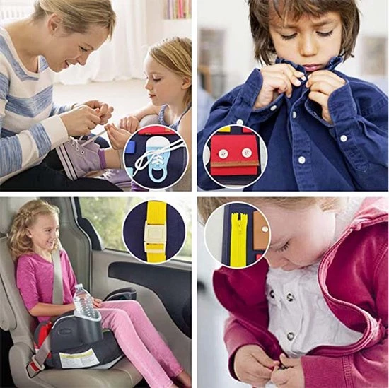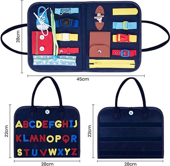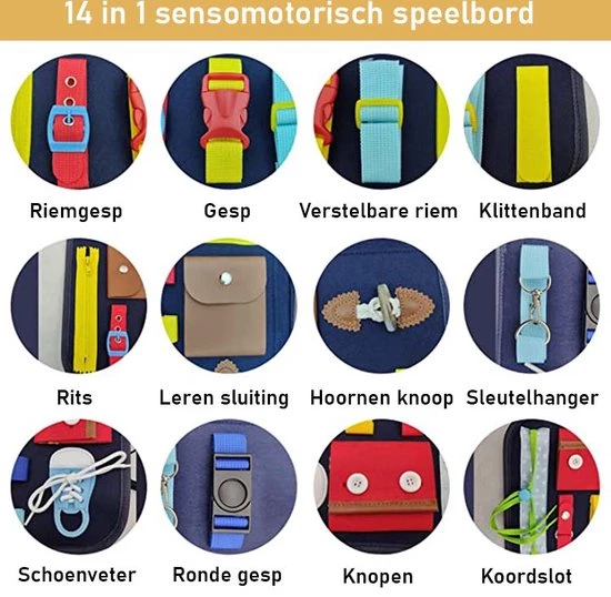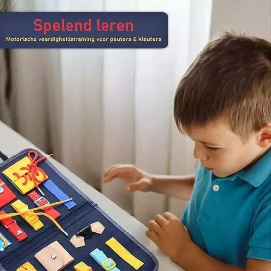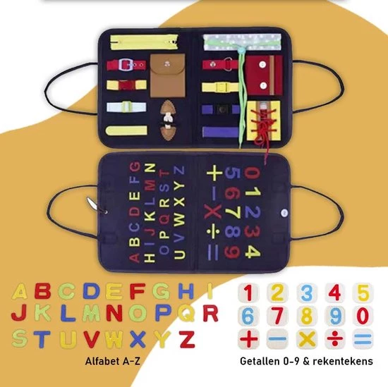 De speelmap van EverGoods bestaat uit 14 verschillende oefeningen waarmee uw kind zich op een aanzienlijk jonge leeftijd al kan ontwikkelen in het begrijpen van verschillende basisvaardigheden. Deze 14 oefeningen verschillen van een gesp, een rits, een schoenveter, tot aan knopen, elastische banden etc. Ook bevat de speelmap alle letters van het alfabet én de cijfers 0 t/m 9. Al met al een leuke en leerzame combinatie!