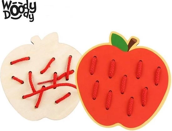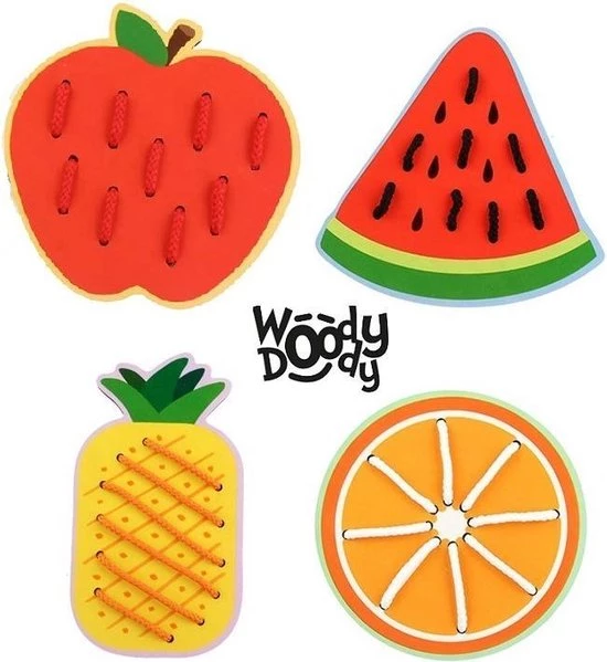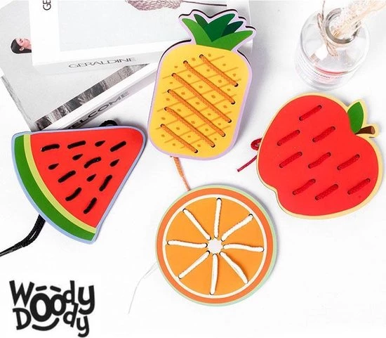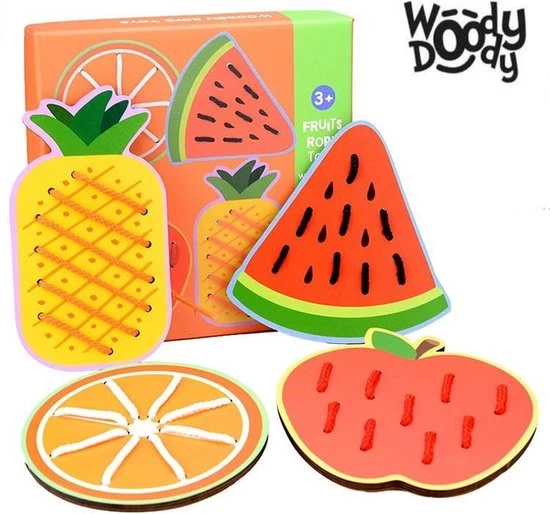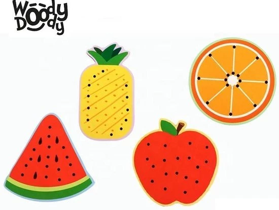 Wie graag de fijne kneepjes wilt leren met vingertjes kan lekker creatief spelen en ontwikkelen met dit fruitig setje van Woodydoody. Motoriek en creativiteit worden benadrukt door de gekleurde veters er een voor een door de fruitsoort van 15cm bij 15cm te prikken. Mooie motieven zoals kruiselingse of parallelle patronen in verschillende kleuren zodat het stukje fruit mooi uitziet!