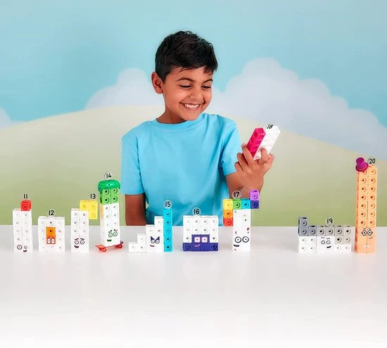 - BOUW UW EIGEN: Gebruik de speciale editie Nummerblokken MathLink Cubes om de Nummerblokken Elf tot Twintig in te bouwen op alle manieren die in de afleveringen worden weergegeven; Set bevat drie leuke karakteraccessoires – Fourteen’s Helm en Skateboard, en Twenty’s Top Hat