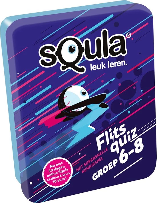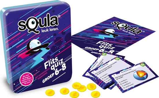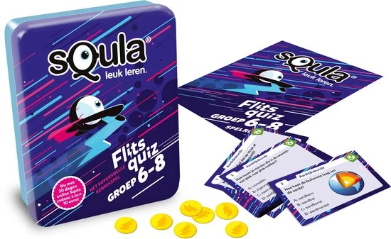 Flitsquiz voor groep 6 t/m 8! Test je kennis in dit flitsende kaartspel! Geef jij als snelste het juiste antwoord? Het spel bestaat uit meer dan 100 uitdagende vragen over verschillende basisschoolvakken. Draai een kaart open op tafel en bedenk het goede antwoord. Weet jij het juiste antwoord? Wees dan snel, voor je het weet is iemand je voor! Degene met de meeste punten wint. Speel snel en slim. Klaar voor de start?… Flits! Veel speelplezier!