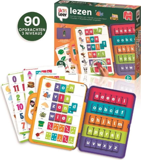 Met ‘ik leer lezen’ leren kinderen spelenderwijs lezen en woordjes spellen. Alle woordjes zijn zorgvuldig gekozen. Ze bestaan uit maximaal 5 letters en sluiten aan bij de woordenschat van een kind van 5 jaar. Het speciale lettersysteem zorgt ervoor dat kinderen zelfstandig kunnen oefenen. ‘Ik leer lezen’ bevat 15 kaarten met 90 opdrachten op 3 verschillende niveaus: woordjes naleggen, begin-, eind- en tussenletters zoeken en woordjes spellen. Met ‘Ik Leer lezen’ oefen je vast thuis wat je straks op school leert!