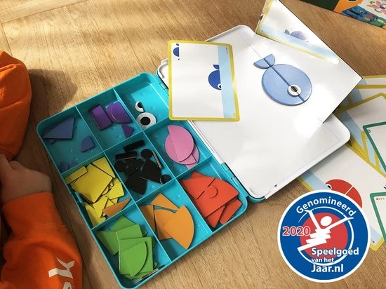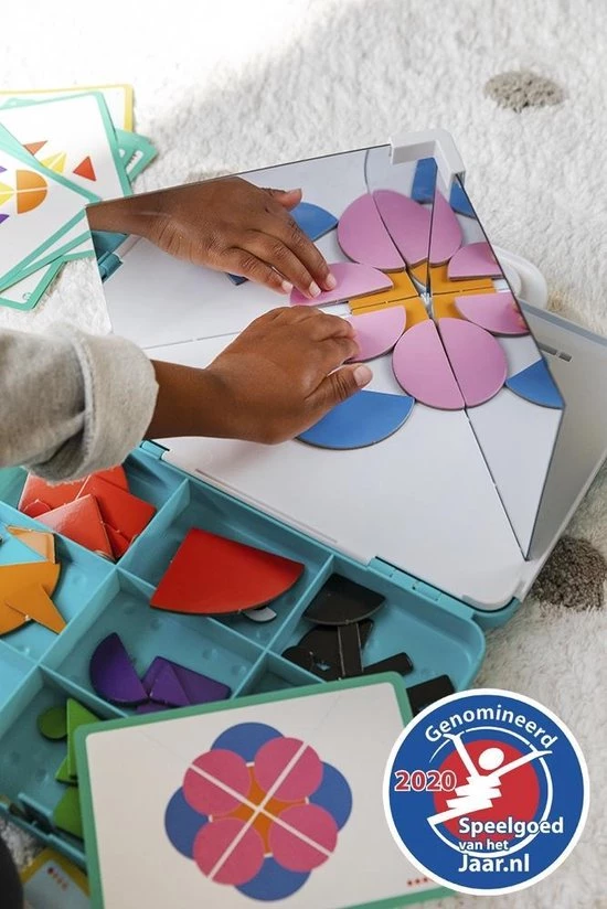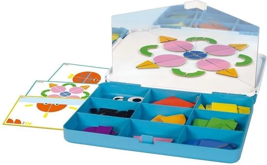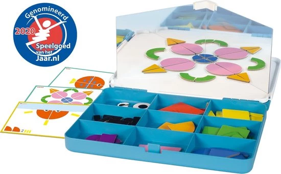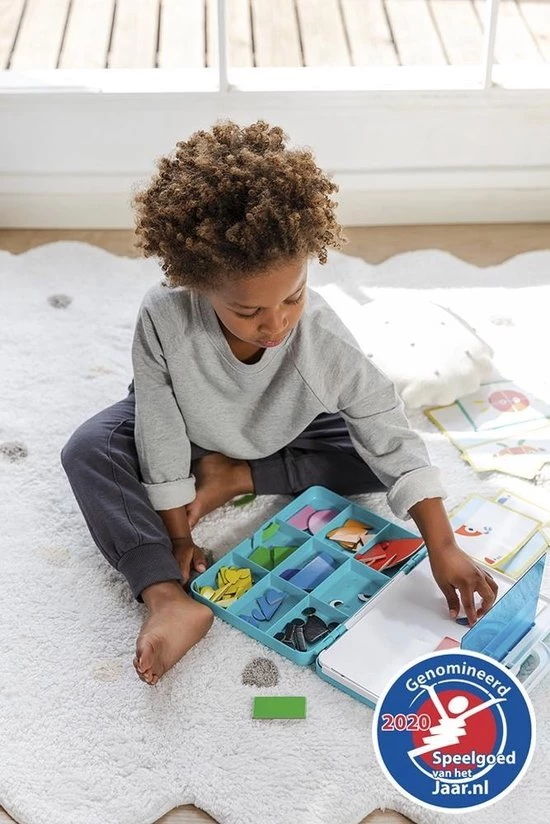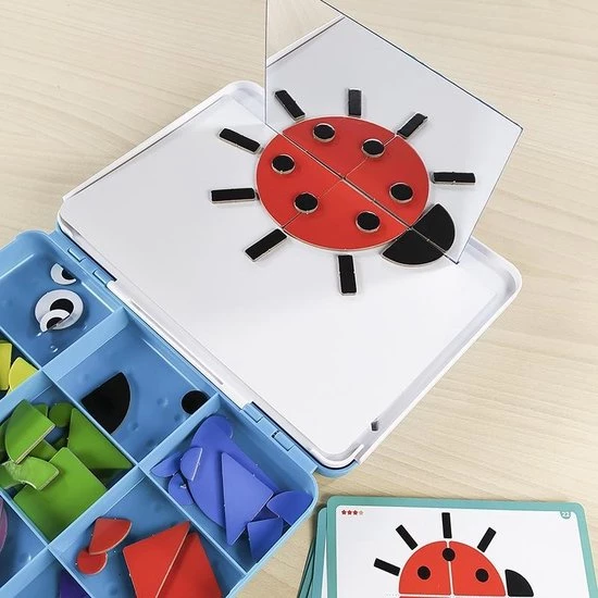 Spelenderwijs de basisprincipes van symmetrie leren. Maak de afbeelding na die je op de kaart ziet, door de vormpjes op de juiste manier neer te leggen. Ontdek het magische effect van de spiegel en zie hoe de volledige figuur verschijnt. De oplossing staat aan de achterzijde van de kaart, zodat de kinderen zelfstandig kunnen spelen en leren. Het spel bevat 40 kaarten met opdrachten op 4 niveaus. Alles netjes opgeborgen in een handige koffer. Geschikt voor kinderen vanaf 5 jaar.