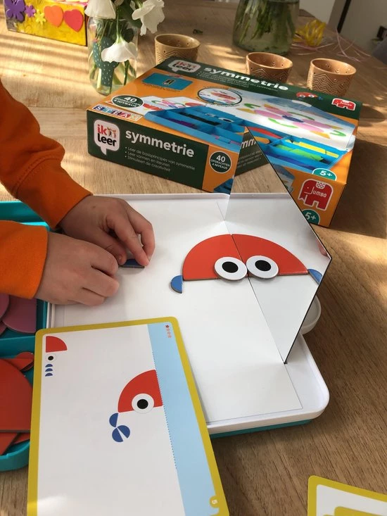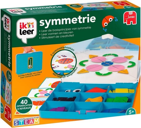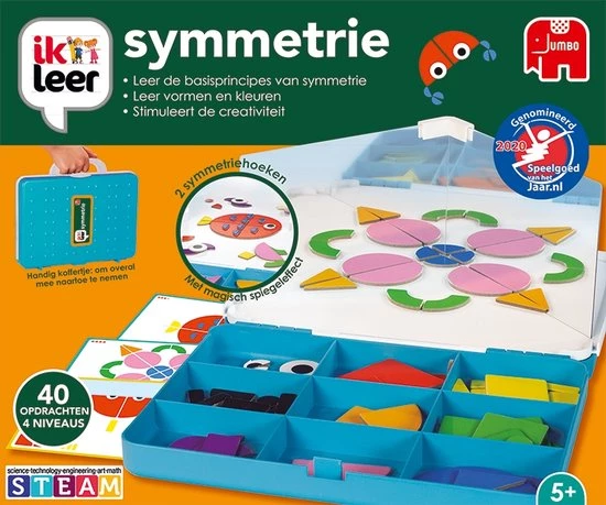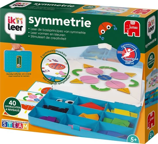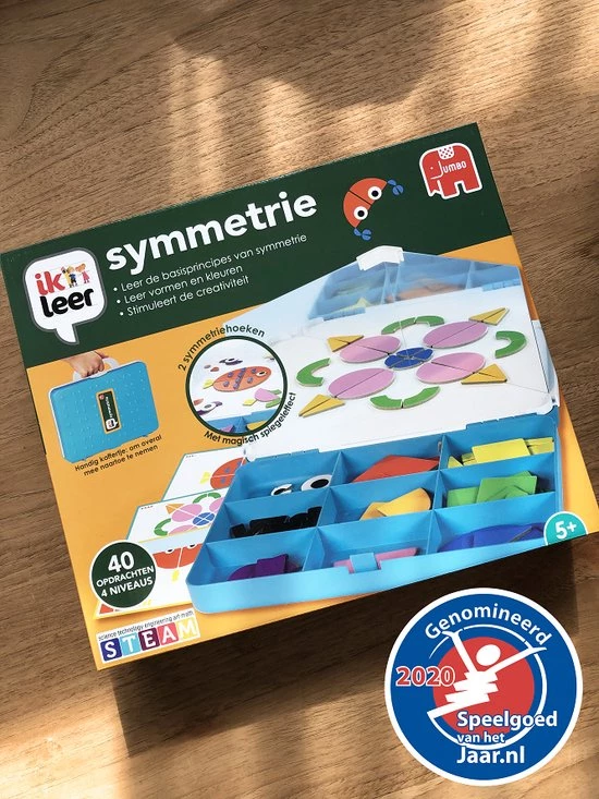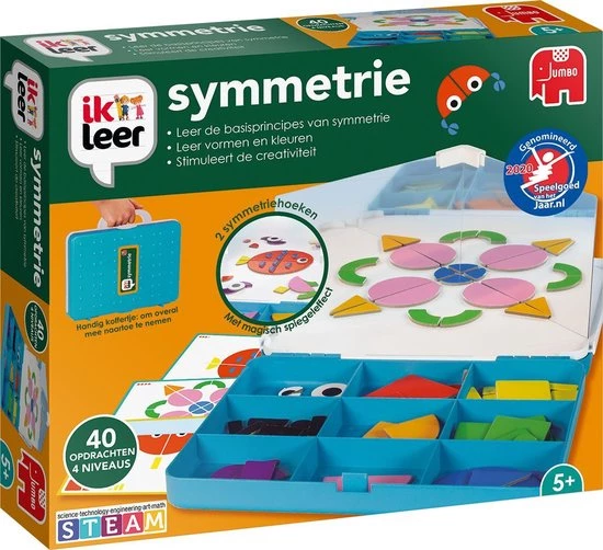 Ik Leer Symmetrie is een verfrissend leuk constructiespel, waarbij visueel-ruimtelijke vaardigheden en logisch denken vereist zijn. Door gebruik te maken van ??n spiegel of twee spiegels, die onder een hoek van 90 graden worden geplaatst, kunnen kinderen symmetrische plaatjes maken door gekleurde vormpjes op het podium voor de spiegel(s) te leggen. In de spiegel(s) wordt dan het totaalplaatje zichtbaar, wat voor de kinderen een leuke verrassing zal zijn. Goed voor het ruimtelijk denken en het bevorderen van creativiteit. Ook esthetisch leuk. Er kan op verschillende niveaus gespeeld worden en eventueel ook met zijn twee?n.