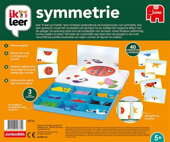 Met ?Ik Leer Symmetrie? leren kinderen spelenderwijs de basisprincipes van symmetrie. Door de vormpjes op de juiste manier te leggen en het magische effect van de spiegel te ontdekken, leren ze figuren en kleuren te herkennen en wordt hun creativiteit gestimuleerd. De oplossing staat aan de achterzijde van de kaart, zodat de kinderen zelfstandig kunnen spelen en leren.