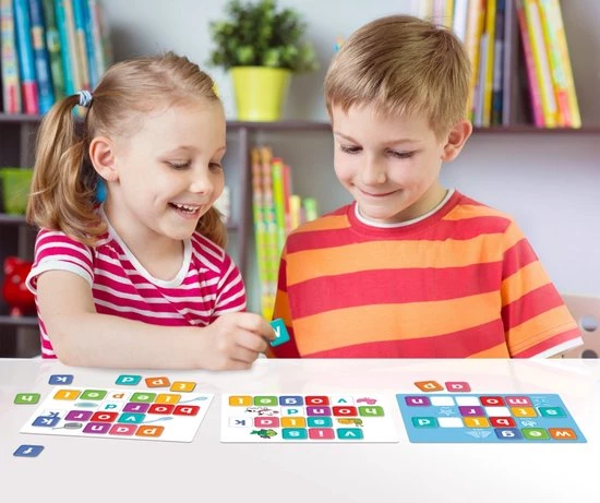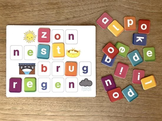 Leer met behulp van de zes spelletjes woordjes spellen. Met de spelletjes leren kinderen spelenderwijs letters herkennen, woordjes spellen, lezen en de woordenschat vergroten. De woordjes bestaan uit drie, vier of vijf letters. Kan jij lezen wat er staat? Zoek de letters en spel het woord. Draai de grote kaart om, dan wordt het spelletje moeilijker. Het spel heeft 6 dubbelzijdige kaarten en 112 letterkaartjes. De spelletjes lopen op in moeilijkheidsgraad en zijn zelfcorrigerend.
