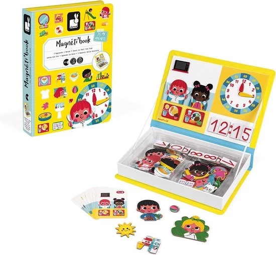 Educatief magneerspel van karton met de tijd leren als thema. bevat 75 magneten en 8 kaarten aan weerskanten zijn bedrukt (=16 taferelen). open het boek en maak hetzelfde dagelijkse tafereek als deze die op de kaart is aangegeven met behulp van magneten. het magnetibook bevat kaarten net op één kant een jongen en op de andere kant een meisje.