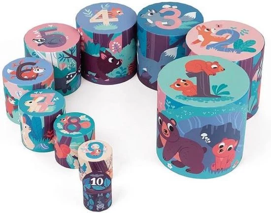 Kartonnen stapeltoren met 10 te stapelen elementen om een schitterende piramide te bouwen in het thema van de dieren uit het bos. Op de bovenkant van elk element bevindt zich een cijfer. Met deze piramide leert uw kind tot 10 tellen en ontwikkelt hij zijn motoriek en verbeeldingskracht op een leuke manier! Geschikt voor kinderen vanaf 12 maanden.