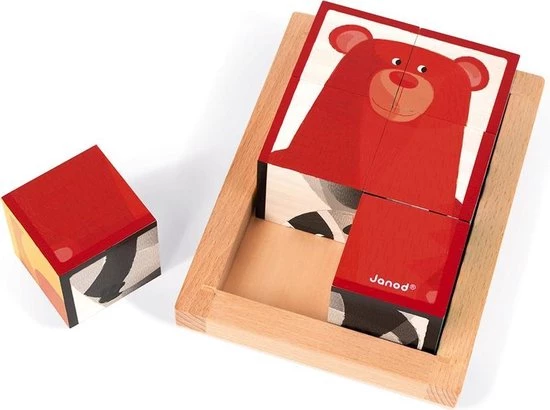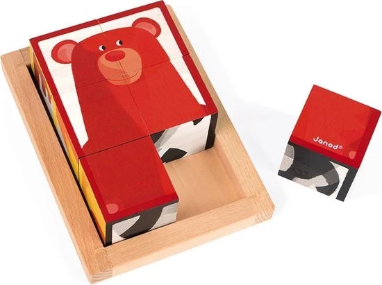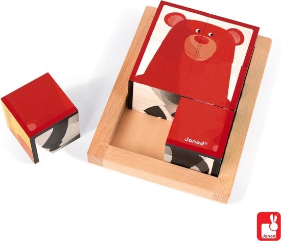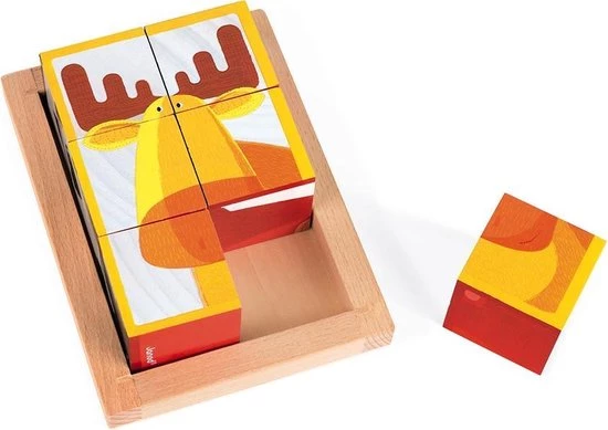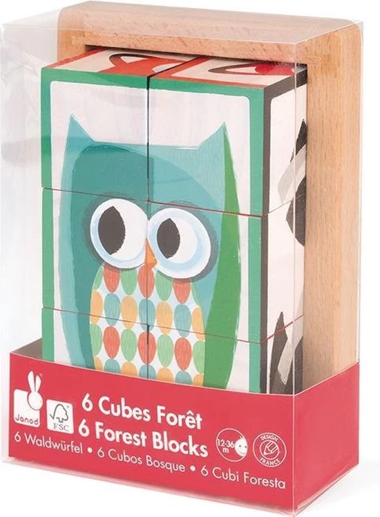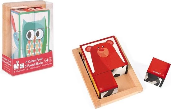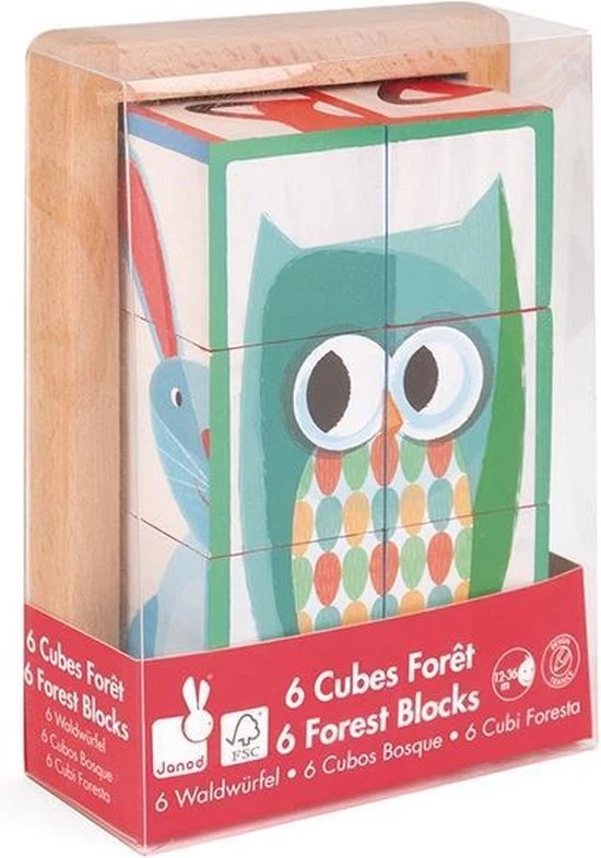 Zigolos: een leuke blokpuzzel met 6 verschillende bosfiguren. Geschikt voor kinderen vanaf 12 maanden. Afmeting blokken: 4,5×4,5×4,5 cm.