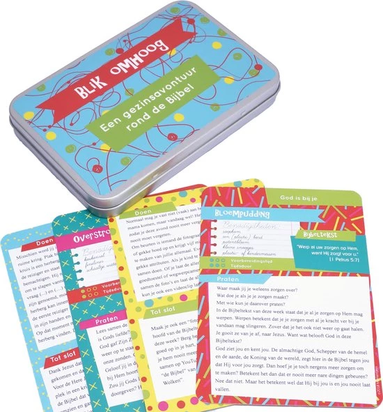 Het blikje bevat 26 spelletjes en activiteiten voor het hele gezin, met de Bijbel als basis. Een mix van lol maken en serieus nadenken. Momenten met diepgang, maar ook gezelligheid. Veelal kort maar krachtig en vooral makkelijk uitvoerbaar. Deze idee?n zijn geschreven voor kinderen van de basisschoolleeftijd, vanaf groep drie tot ca. groep acht. Maar grotere of kleinere kinderen kun je er ook prima op hun eigen niveau bij betrekken.