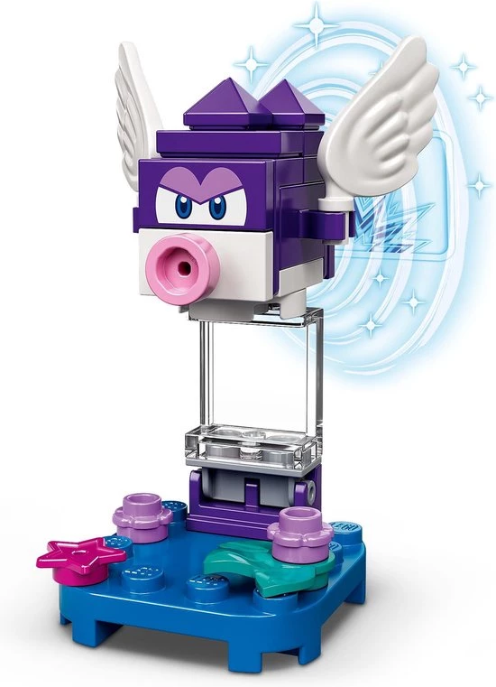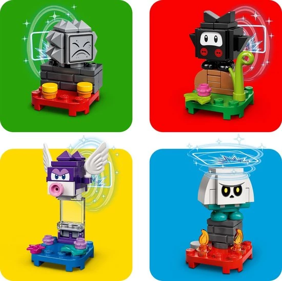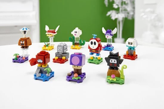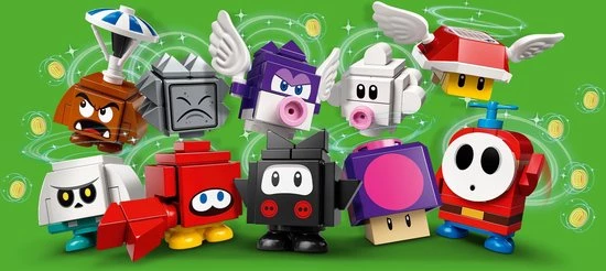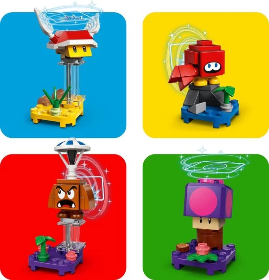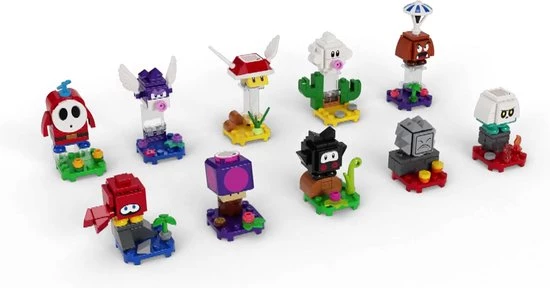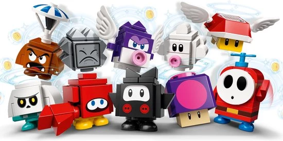 - Er zijn 10 unieke LEGO? Super Mario? speelgoedpersonages om te verzamelen en mee te spelen: Huckit Crab, Spiny Cheep Cheep, Ninji, Foo, Parachute Goomba, Para-Beetle, giftige paddenstoel, Thwimp, Fly Guy en Bone Goomba.