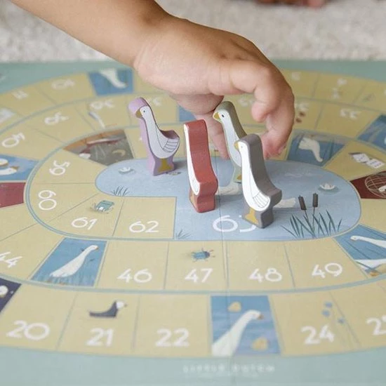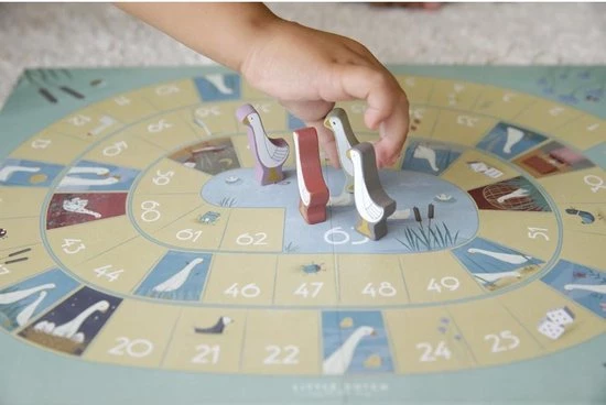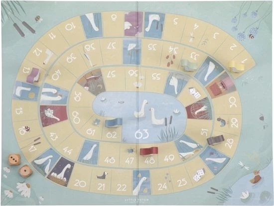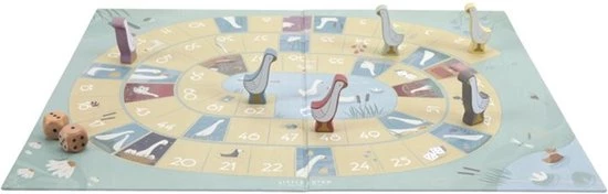 - Inhoud: 1 spelbord, 6 ganzen en 2 dobbelstenen