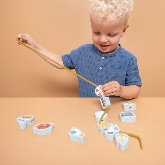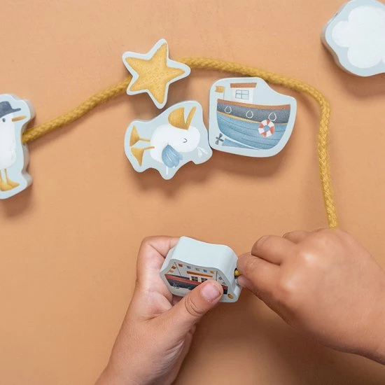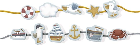 Ahoy, kleine matroos! Beleef telkens een nieuw avontuur in de baai met deze massief houten rijgkralen van Little Dutch. Deze houten kralen, met afbeeldingen van o.a. een vuurtoren, zeilboot en vogels uit de Sailors Bay serie, zijn extra groot en hebben een ruime uitsparing zodat kleine handjes ze makkelijk aan een veter kunnen rijgen. Inclusief 2 veters om aan te rijgen.