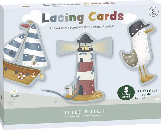 Ahoy, kleine matroos! Beleef telkens een nieuw avontuur in de baai met deze kartonnen rijgfiguren van Little Dutch. Deze set bestaat uit 5 grote, stevige kartonnen kaarten, met afbeeldingen van o.a. een vuurtoren, zeilboot en vogels uit de Sailors Bay serie. Rijgen bevordert de oog- handco?rdinatie en is goed voor de ontwikkeling van de fijne motoriek. Inclusief 4 veters om mee te rijgen.