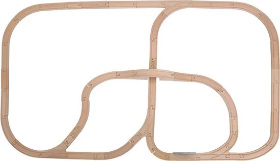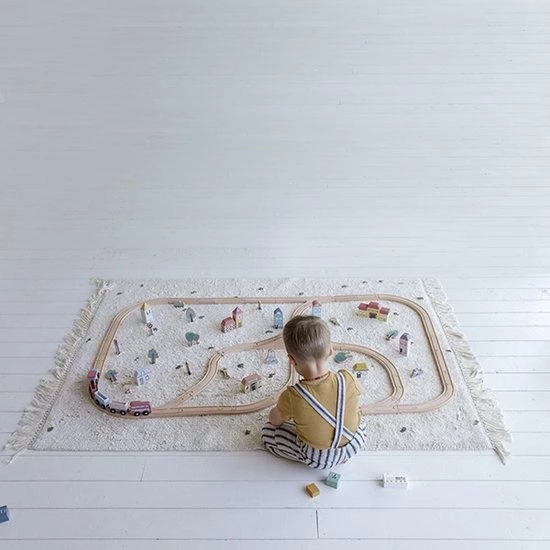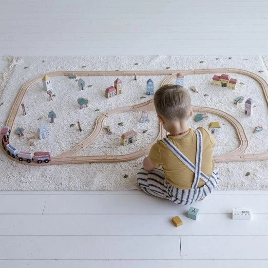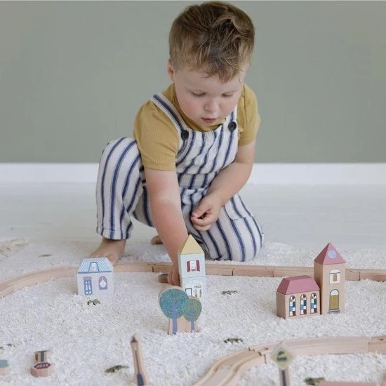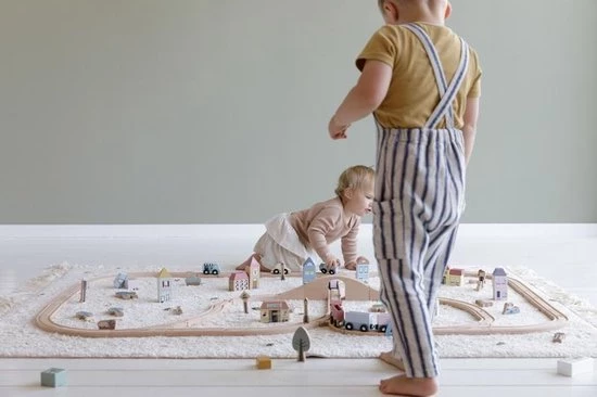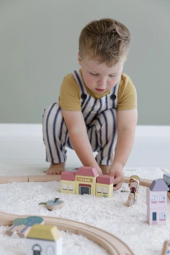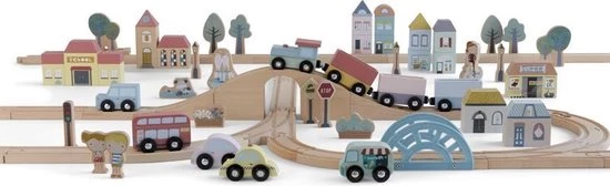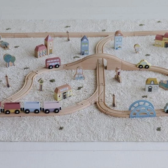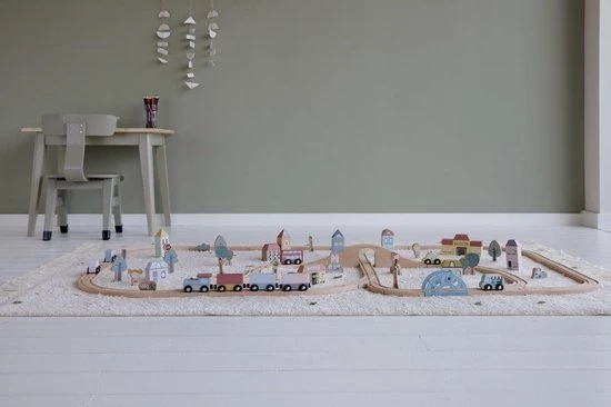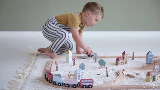 Deze complete houten treinbaan met stad is van het merk Little Dutch.
