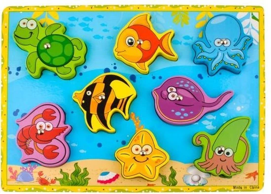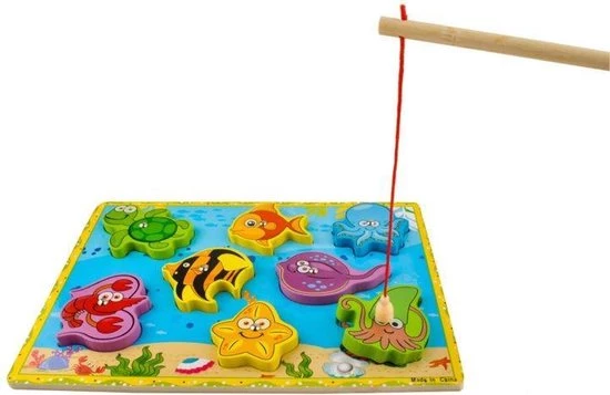 - 10 ELEMENTEN – in de set staat een tafel waarop 8 dieren met metalen pinnen zijn gestapeld. De set wordt vergezeld door een hengel, waarmee je een dier van het bord kunt halen. De magneten zijn erg sterk, dus zelfs een 3-jarig kind kan gemakkelijk vis vangen.