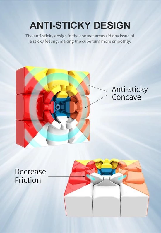 Voorheen gebeurde het wel eens dat bij intensief gebruik van een speed cube er een blokje uit sprong, Het ontwerp van deze kubus heeft daar een einde aan gemaakt door het anti-pop design.