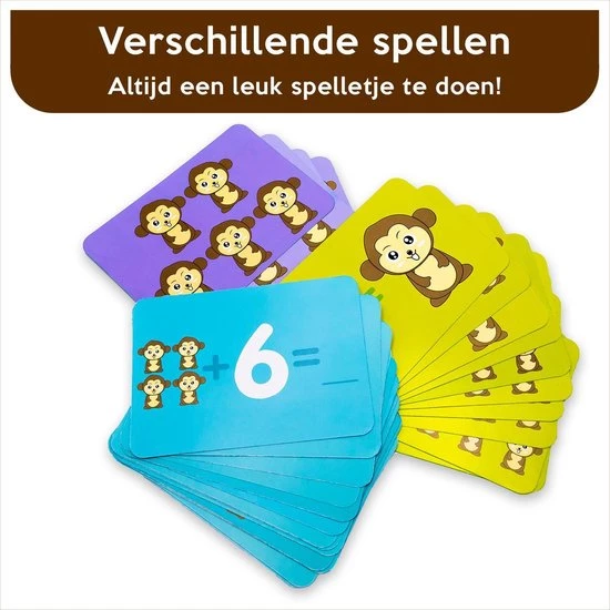 De moeilijkste spelvorm is gericht op het ontwikkelen van de rekenvaardigheden. Op de kaartjes staan rekensommetjes die opgelost moeten worden. Leg de bijbehorende getallen en aapjes op de weegschaal om de weegschaal in balans te brengen.