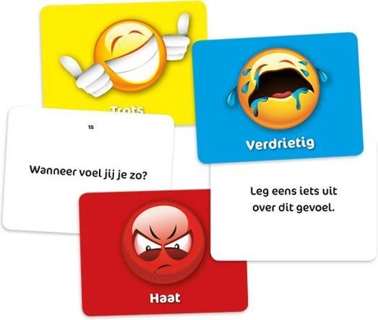 In dit spel vind je veertig soorten gevoelens, gekoppeld aan veertig verschillende vragen. Zo kun je spelenderwijs en in alle rust gevoelens bespreken met kinderen. De gevoelens zijn onderverdeeld in vijf kleuren, die de vijf bekendste basisemoties vertegenwoordigen: boos, bang, verdrietig, blij en body (direct fysieke emoties). Geschikt voor gezinnen en klassen en in professionele setting.