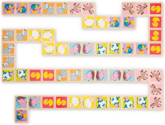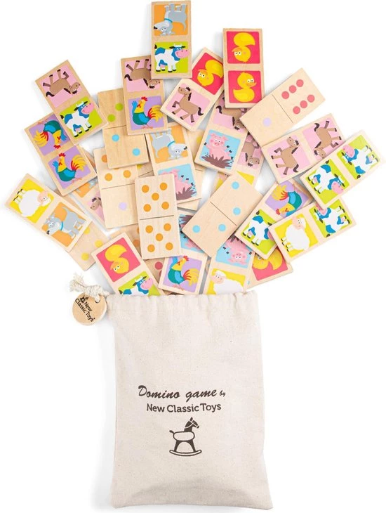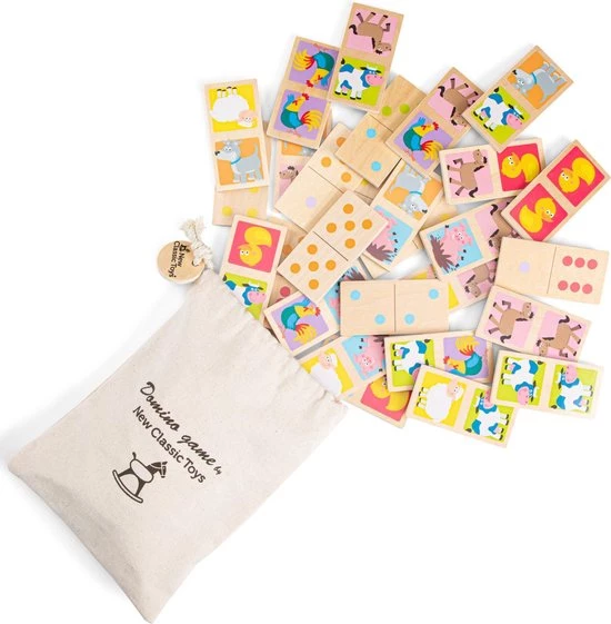 Dit houten dominospel van New Classic Toys is een perfect spel voor de kleintjes. Het heeft 28 dubbelzijdige dominostenen met vriendelijke boerderijdieren aan de ene kant en stippen aan de andere kant. Het spelen van dit spel is een uitstekende activiteit voor het ontwikkelen van fijne motoriek, probleemoplossend vermogen en het trainen van logisch denken.