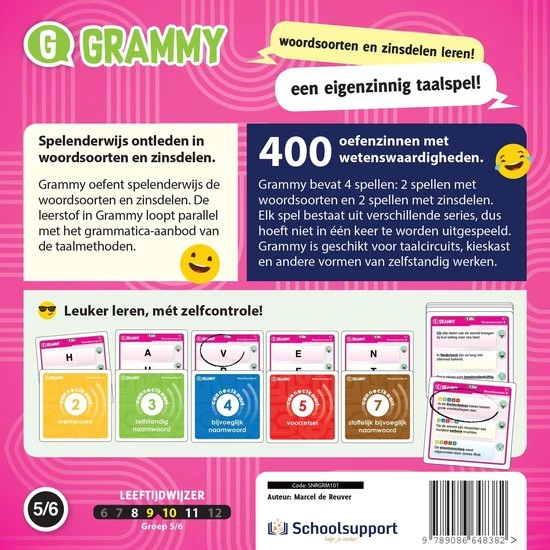 Dit is de Grammy speldoos om het oefenen mee te starten, op weg naar referentieniveau 1F. Grammy is een zelfcontrolerend taalspel voor de bovenbouw basisonderwijs en onderbouw VO. Ontwikkeld voor het spelenderwijs oefenen van woordsoorten, zoals zelfstandig naamwoord, bijvoeglijk naamwoord, voorzetsel, bijwoord e.a.. En voor het oefenen van zinsdelen, zoals onderwerp, gezegde, lijdend voorwerp e.a..