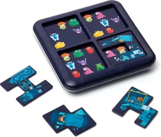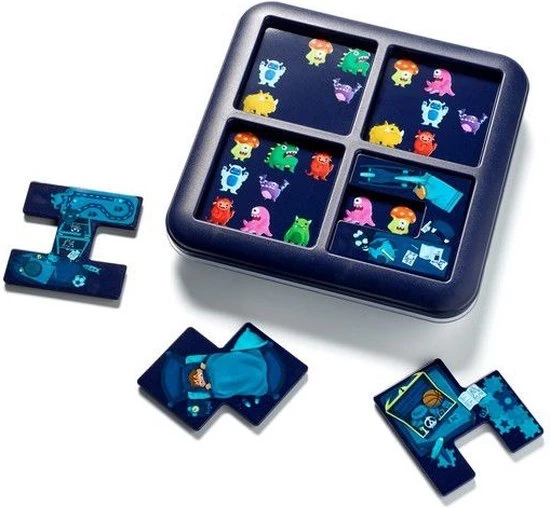Deze monsters spelen verstoppertje in de slaapkamer! Ze zijn er alleen niet zo goed in, kun jij ze helpen verstoppen? Het speelbord bestaat uit 4 vakken en 4 puzzelstukken die er precies in passen. Kies een opdracht in het boekje, en daar zie je welke monstertjes zich niet weten te verstoppen. Plaats de stukjes zo in het speelbord dat precies de monstertjes op de opdrachtkaart nog zichtbaar zijn.