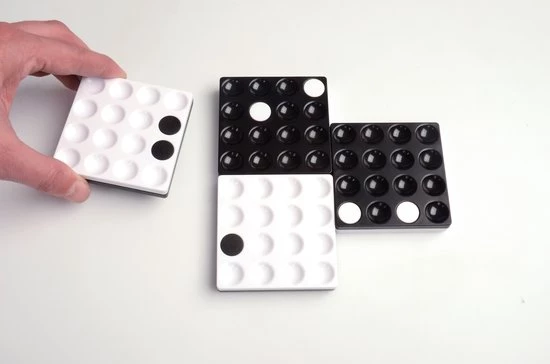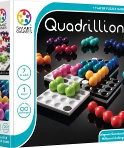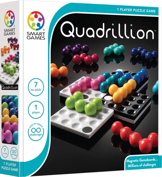 Klik en speel! Ontelbaar veel opdrachten en oplossingen? maar kan jij er ??n vinden? Klik de 4 magnetische spelborden willekeurig tegen elkaar en je bent klaar om te spelen. Plaats de 12 kleurrijke puzzelstukken op het grote spelbord dat je net hebt gemaakt. Er zijn ontelbare spelbordcombinaties mogelijk en ze zijn allemaal oplosbaar. Quadrillion is een denkspel waarbij je nooit zonder nieuwe opdrachten komt te zitten. De grote, stevige puzzelstukken zijn ideaal voor spelers van elke leeftijd. Om je op weg te helpen, zit er ook een boekje bij met een selectie van opdrachten van makkelijk tot razend moeilijk. Deze opdrachten hebben slechts ??n oplossing. Gebruik deze voorbeeldopdrachten? of maak er zelf. Inhoud: 4 magnetische spelborden, 12 grote kleurrijke puzzelstukken, opdrachtenboekje.