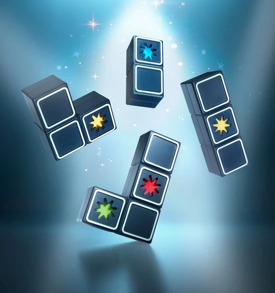 | Verpakkingsinhoud | 4, dubbelzijdige, blokken, met, sterren, die, van, kleur, veranderen, wanneer, je, de, blokken, kantelt, boekje, met, 80, opdrachten, en, oplossingen, foldertje, met, spelregels. |