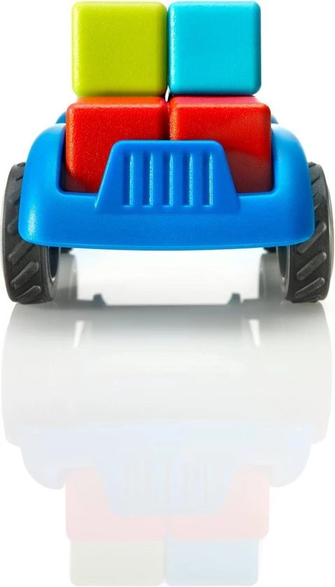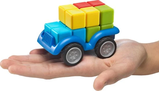 Kan jij een auto volgens plan in elkaar zetten? Plaats de 4 blokken op de juiste plaats en maak een testritje met je auto. SmartCar Mini is een leuke, compacte 3D-puzzel met 24 opdrachten. Spelregels Kies een opdracht en plaats alle blokken naast het chassis. Gebruik de 4 blokken om een auto te bouwen, waarbij de kleuren overeenkomen met de opdracht. Witte vierkantjes betekenen dat je de kleur van die puzzelstukken niet kent. Gebruikt deductie en logica om te ontdekken welke kleuren daar passen. Starter-opdrachten tonen een volledig zijaanzicht. Junior-opdrachten tonen een onvolledig zijaanzicht (met een aantal witte vierkantjes) Expert-opdrachten tonen een onvolledig voor-, zij- en bovenaanzich. Master-opdrachten tonen een onvolledig voor- en achteraanzicht. Er is maar 1 oplossing, die je in het boekje kan terugvinden. Inhoud: 1 auto met 4 wielen, 4 blokken in 4 verschillende kleuren, 1 boekje met 24 opdrachten.