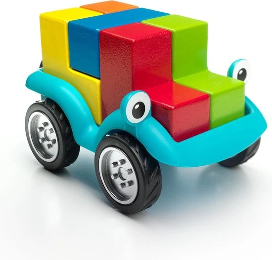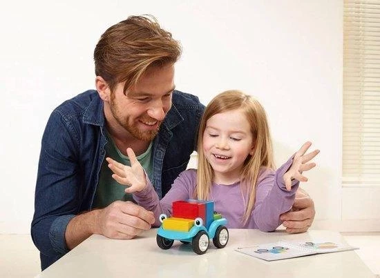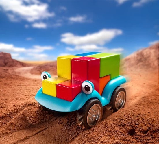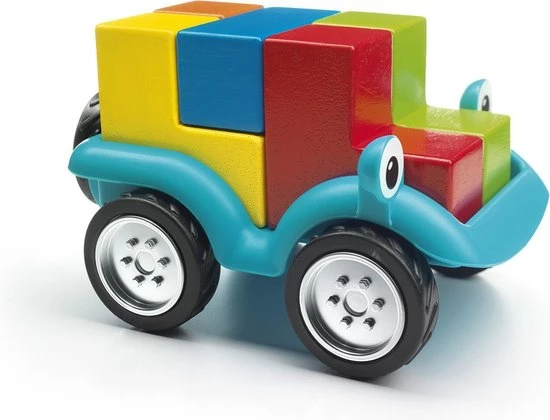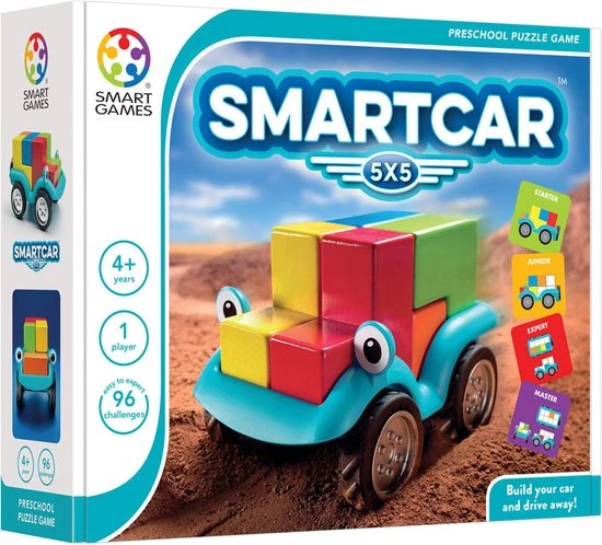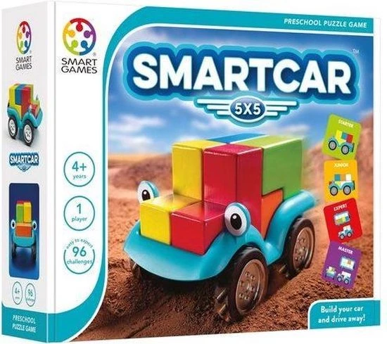 Bouw je auto en maak een ritje! Daag je kinderen uit om een auto te bouwen met 5 verschillende blokken in dit unieke denkspel! Smartcar 5×5 bevat een auto en 5 houten blokken in 5 verschillende kleuren. Kinderen kunnen alle 96 opdrachten oplossen door dankzij de tips de blokken op de juiste manier in de auto te zetten. SmartCar 5×5 is een denkspel en een speelgoedauto… los de opdracht op of neem je auto en maak een ritje! Leeftijd 4-9