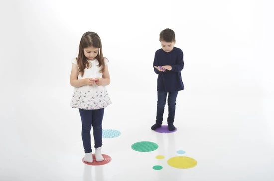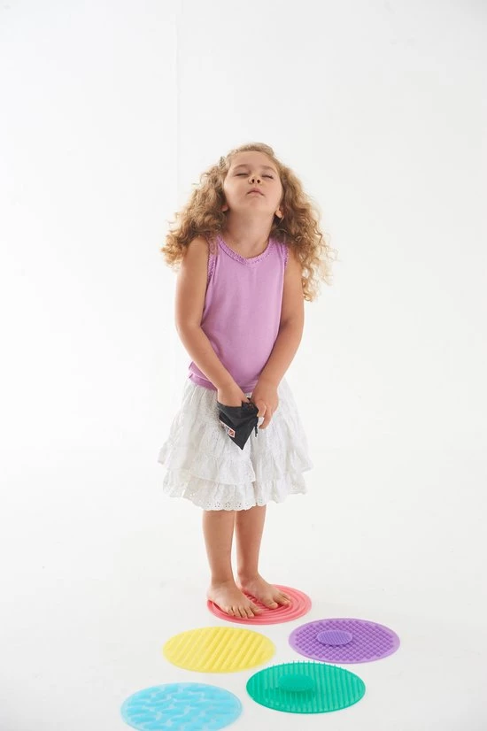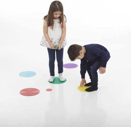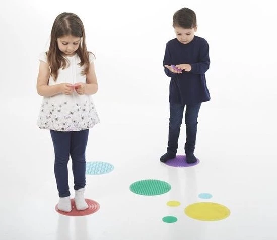 Kinderen kunnen de texturen voelen en hun verschillen ontdekken. Door de kleine schijven in de bijgeleverde voelzak met de handen af te tasten, kunnen kinderen proberen het patroon te beschrijven of te voorspellen. En door met hun blote voeten over de grote sensorische schijven te lopen kunnen ze leren patronen met hun voeten van elkaar te onderscheiden. Het via aanraking zoeken naar overeenkomsten tussen de kleine en grote sensorische schijven is ook erg leuk, met of zonder een blinddoek.