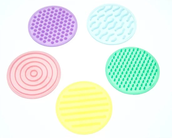 Deze set bestaat uit tien getextureerde ronde schijven, gemaakt van ultrazachte flexibele siliconen – vijf grote en vijf kleine. Op het oppervlak van elke schijf is een patroon aangebracht dat zich onderscheidt en verschilt van de overige schijven.